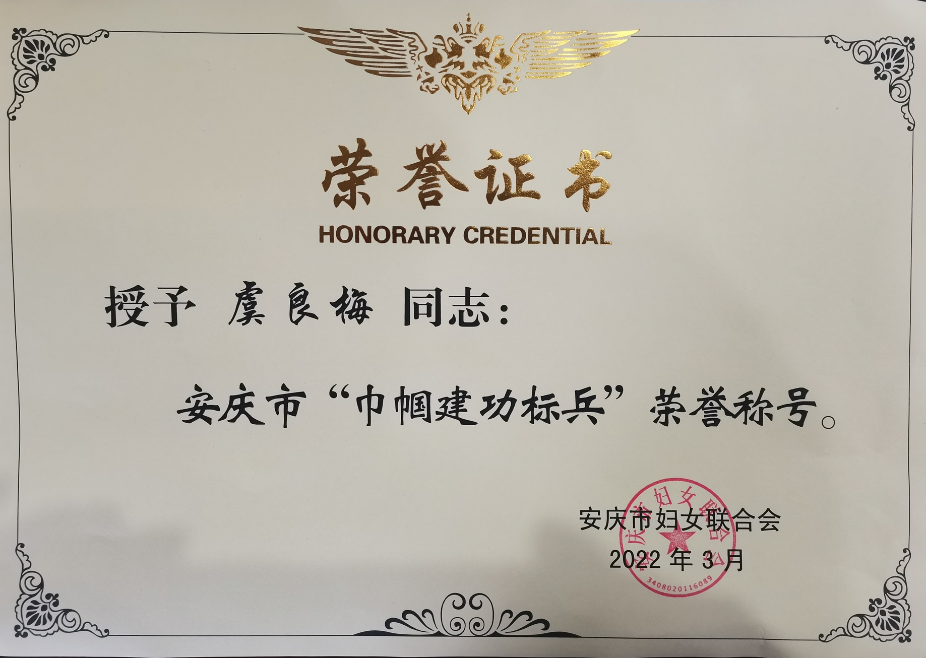 我司榮獲”安徽省巾幗建功先進集體“稱號,虞良梅同志個人”巾幗建功標兵“榮譽稱號。