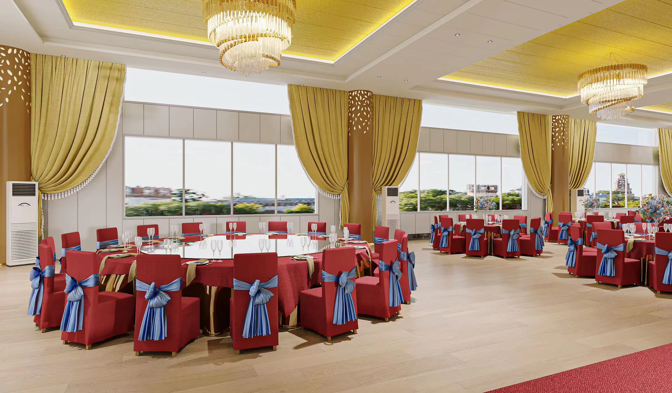 公司會議大樓第三層正在裝修施工中,設計裝修成容納800人左右的宴會大廳,為迎接疫情結束后,全廠職工聯(lián)歡而準備的金色餐廳。待到春花爛漫時,我們相聚在同發(fā)。